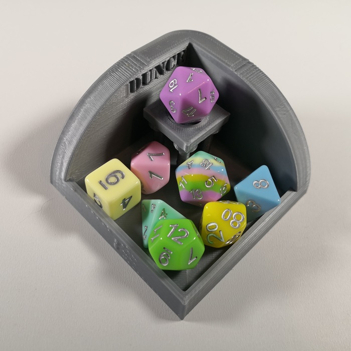 3D Printed in PLA, this is a dice dunce corner - the perfect way to shame the bad rolling dice in front of its friends (dice not included)