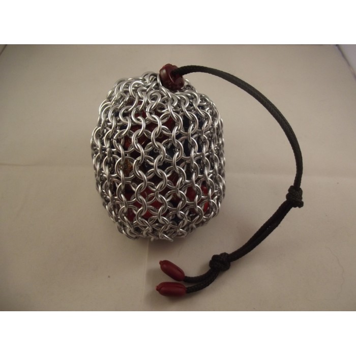 Aluminium butted chain with a paracord draw string opening and a stopper lock to keep it closed. The ends of the paracord have covers to help prevent fraying over time